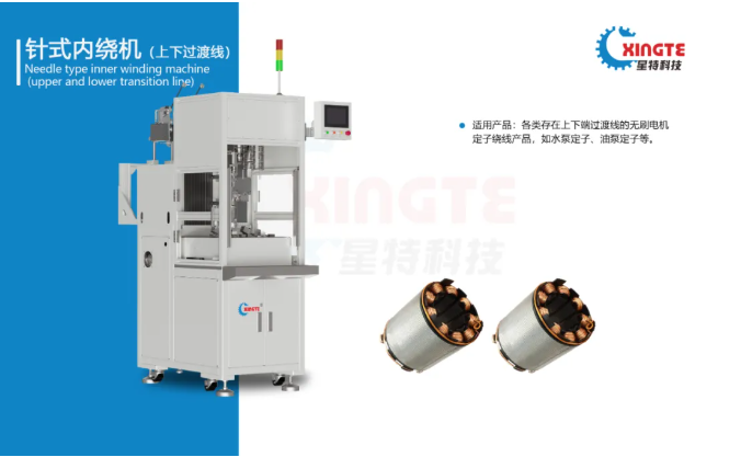另(lìng)一款(kuǎn)明星產品——針式內繞機(jī)(上下過線),則是專為水泵、油泵定子量身(shēn)打造。它通過獨特的鉤(gōu)線機構,成功實現了定子上下過渡(dù)線的全自動精(jīng)密纏繞,一舉攻(gōng)克了長期困(kùn)擾行業的工藝難題,展現了星特科技在細分領域的技術突破能力(lì)。